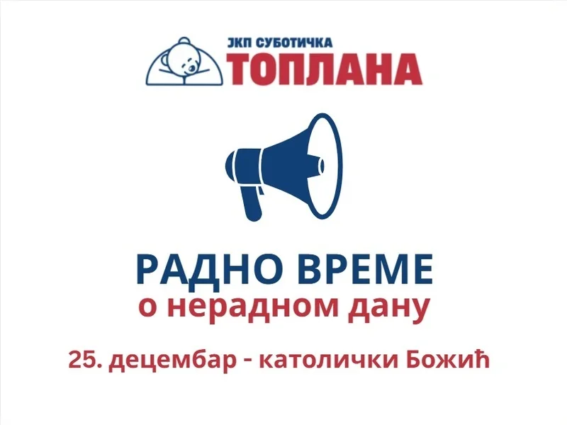 Povodom nadolazećeg vjerskog blagdana – katoličkog Božića, JKP ‘Subotička toplana’ obavještava kupce toplinske energije da je neradni dan 25.12.2025. godine.