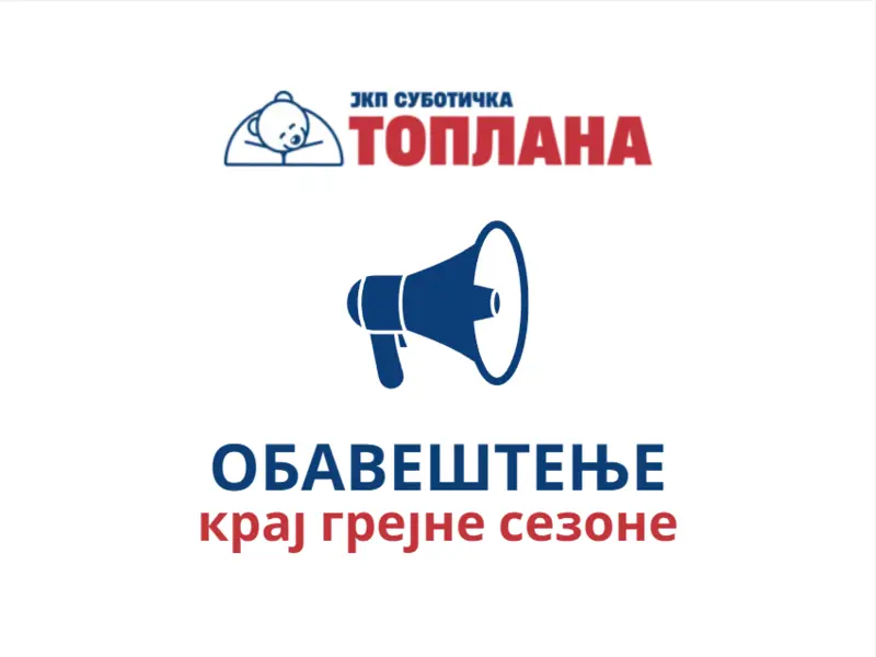У складу са Одлуком о условима и начину снабдевања топлотном енергијом грејна сезона се завршава  15. априла 2026. године. У том смислу ЈКП „Суботичка топлана“ обавештава купце топлотне енергије да ће у току данашњег дана, сагласно наведеној регулативи, прекинути производњу и испоруку топлотне енергије у овој грејној сезони. Сагласно Одлуци о условима и начину снабдевања топлотном енергијом ЈКП „Суботичка топлана“  ће испоручивати купцима топлотну енергију у периоду од 15. априла до 30. априла, уколико спољна температура три дана узастопно у 21 час буде  нижа од 12 °C , према подацима Републичког хидрометеоролошког  завода. С обзиром на прогнозиране временске прилике по којима ће се дневне температуре кретати изнад горње температурна граница рада система од +14 °C, ЈКП  „Суботичка топлана“  ће у наведеном периоду своје производне и дистрибутивне капацитете држати у приправности како би се, у случају потребе, производни и дистрибутивни процес евентуално наставио.